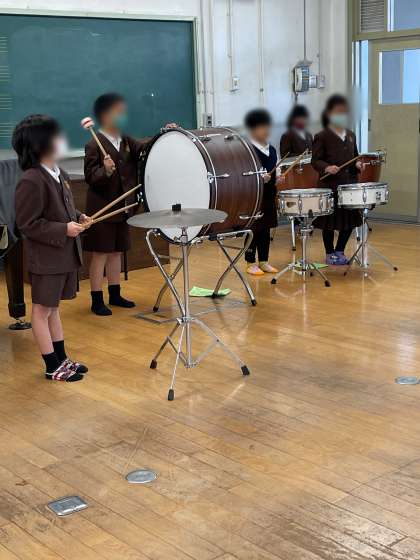 音楽科の学習では、新型コロナウイルス感染症拡大防止として、リコーダーや鍵盤ハーモニカは使わず、打楽器のみで音をあわせています。