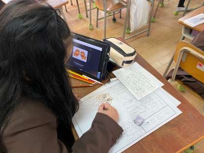 タブレットを見てシーサーのイラストを描いたり、どう記事にすればよいかわからないことは友だちに相談したりと工夫しながら新聞を作っています。
