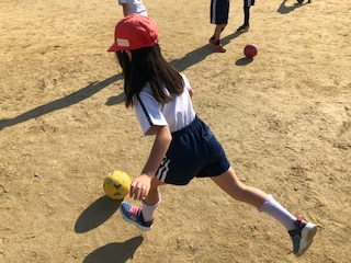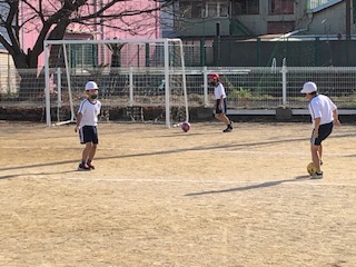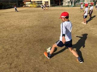 基本的なドリブルやパス、シュートの練習をしたあと、チームでの練習に取り組んでいます。練習したことを試合に出せるよう、一生懸命プレーしています。