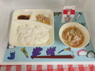 「豚汁」は、豚肉を主材に、じゃがいも、たまねぎ、だいこん、ごぼう、にんじんを使っています。
