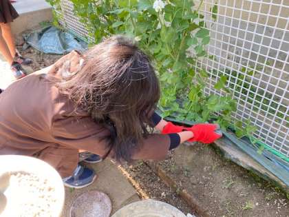 4年生が育てているスナップエンドウがすごく大きくなりました。肥料を加え、さらに大きく育つといいですね。