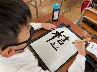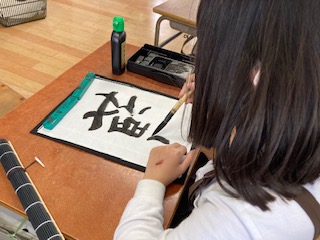 今日は、4年生になって初めての習字の学習を行いました。「とめ」や「はね」などの基本的な書き方を復習したあと、自分の名前の一字を大きく書きました。とても丁寧に書くことができていました。