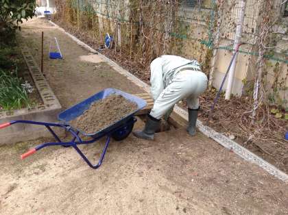 運動場横の側溝にかなりの砂と泥が溜まっていました。一輪車で何往復もする作業でした。