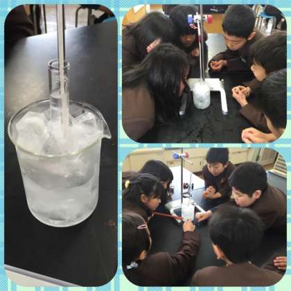 3月4日、今日は理科の「水のすがた」の実験で、「水は何度で凍るのだろうか?」「水を凍らせると、体積は変わるのだろうか?」という2つの課題を解決するために2つの実験をしました。