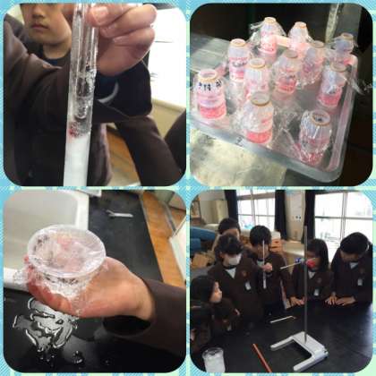 プリン等の空き容器には水を入れて、理科室の冷凍室で冷やしています。