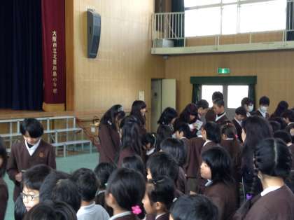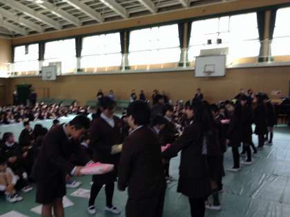 6年生の歌が終わると、ハッピーグループのみんなからプレゼントをもらいました。もちろん6年生から各クラスへのプレゼントも渡しました。
