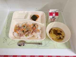 「豚丼」は、豚肉、糸こんにゃく、たまねぎ、にんじんをいためて煮、ごはんに合う味付けにしています。斜め切りの青ねぎで彩りを添えています。