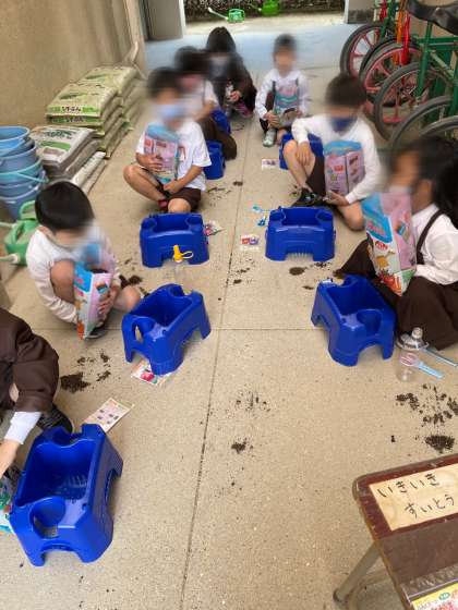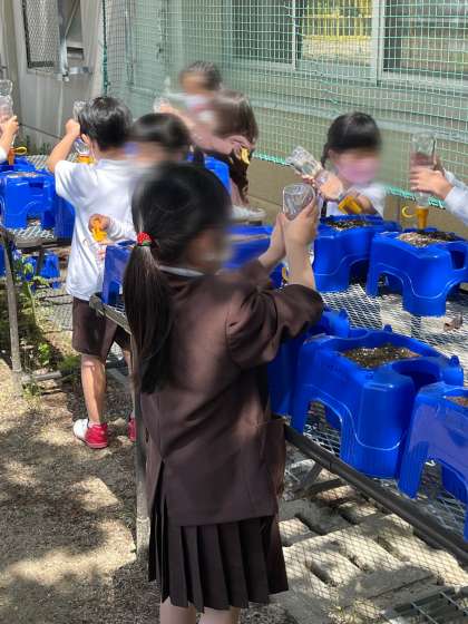 その後、外に出て、実際に種まきをしました。まず、植木鉢に土を入れて、平らにして種をまきました。ほとんどの児童が、上手に種をまくことができました。