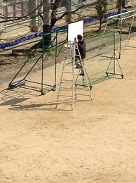 先日もお伝えしましたバスケットボールのボードがきれいになります。マスキングテープを貼り、ペンキを塗っています。