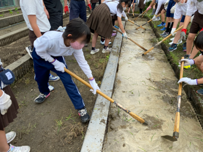 5年生は、総合的な学習で米作りにチャレンジします。先日、雑草を抜きをしました。そして、よりよい土にするために「代かき」をしました。