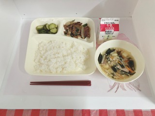 「とうふのスープ」は、とうふと焼き豚を主材に、にんじん、もやし、えのきたけ、わかめを使っています。豚骨スープで旨みとコクを出しています。