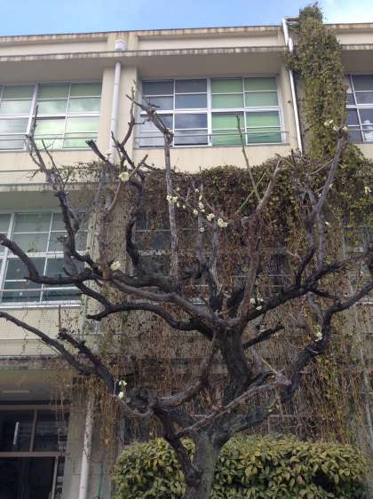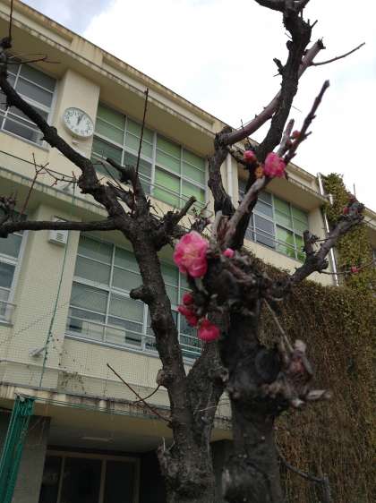 梅の花がいくつか咲き始めました。風が吹くと寒く、雪もちらつきましたが、日差しは強く春が近づいてるようです。