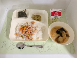 「かやくご飯」は、鶏肉、ちくわ、にんじん、さんどまめを具材にし、喫食時に混ぜ合わせ、きざみのりをかけて食べます。