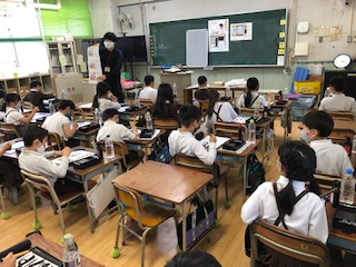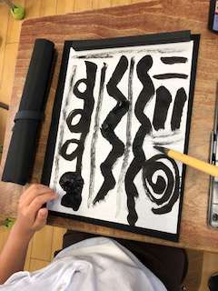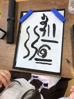 習字道具を使っての初めての書写です。用具の名前や準備の仕方を学習したあと、いよいよ半紙に筆を走らせてみました。