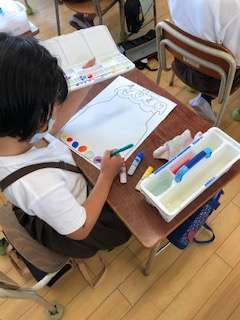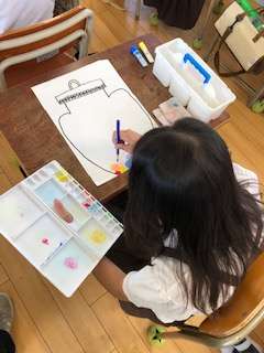 それぞれ好きな形のビンをかいて、色をまぜたり、水で薄めたりしてたくさんの美味しそうなキャンディーをかいていました。