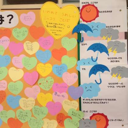 など、「言われてうれしかった!」「気持ちが元気になった!」子どもたちのニッコリ言葉がたくさん貼られています。