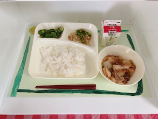 「すき焼き煮」は、牛肉、ふ、あつあげ、糸こんにゃく、たまねぎ、えのきたけを砂糖、みりん、塩、こいくちしょうゆで甘辛く味付けします。この献立は【ふ】の個別対応献立です。