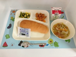 「てぼ豆のスープ」は、ベーコンでからいりし、たまねぎ、にんじん、じゃがいも、てぼ豆、青みにパセリを使用したスープです。