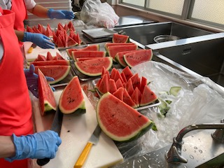 給食室で1玉を64等分に切っています!