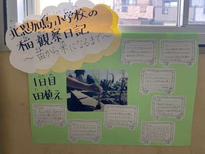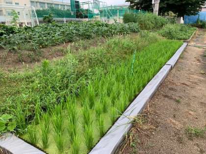 5年生みんなで植えた稲の観察日記です。田植えから3週間がたち水面から30センチほど成長しています。これからの成長が楽しみです。
