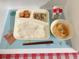 これに冷凍のあつあげを焼き物機で蒸し焼きにし、しょうがじょうゆをかけた「あつあげのしょうがじょうゆかけ」を組み合わせています。