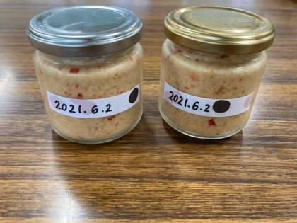 丁寧に「さやむき」をし、やわらかくなるまで茹で、つぶして、塩、こうじ、刻んだ唐辛子を混ぜて、ビン詰めしました。