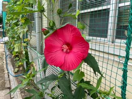 4年生の学習園でタイタンビカスという花を育てています。南国風の一日花で毎日かわるがわる咲き続けています。「大きい!」「きれい!」と嬉しそうに見ています。