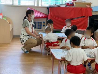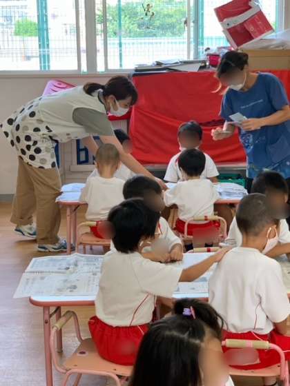 社会体験の一環として、本校の教員が北恩加島幼稚園で研修をしました。幼稚園の子どもたちは、とても元気で、すぐに先生になついていました。子どもたちの目線と同じ高さで話をしたり、同じクラスの先生と打ち合わせをしたりする姿は、すっかり幼稚園の先生のようでした♪
