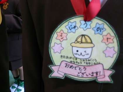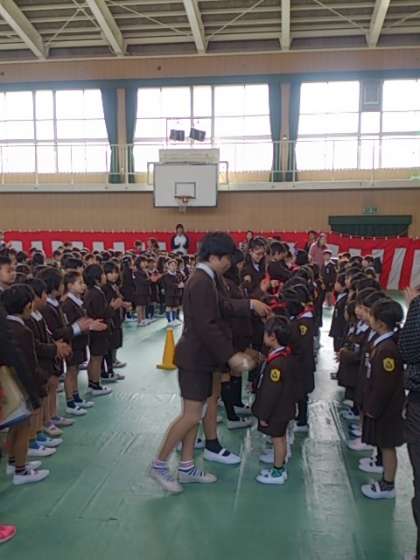 そして、一人一人に6年生から記念のメダルが贈られました。メダルに描かれた、北恩加島小学校児童会公式ゆるキャラの「キタニャン」も1年生を歓迎しています。