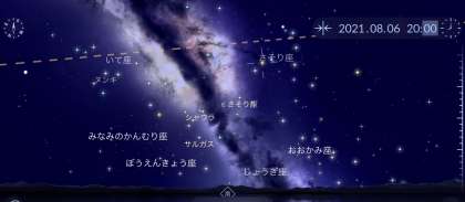 6日午後8時、北恩加島の南の空に、さそり座を見ることができます。さそり座の中で最も明るい星がアンタレスです。夏の南の空に、赤く輝くよく知られている恒星の一つです。曇り空で見ることができないかもしれませんが、探してみてください。