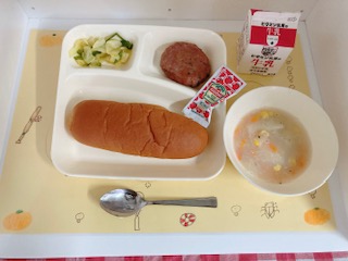 「焼きハンバーグ」は、製品のハンバーグを焼き物機で焼きます。ケチャップをつけて食べます。