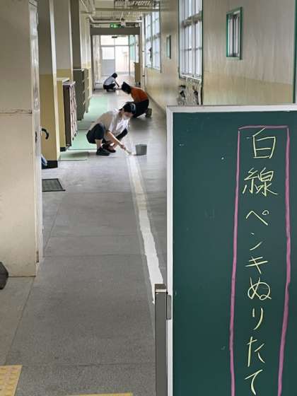 子ども達が廊下を歩くように、右側通行をすることでケガをしないようにと、夏季休業中に教職員でろうかに中央線をひきました。