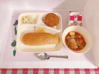 「ケチャップ煮」は、豚肉、じゃがいも、たまねぎ、にんじん、さんどまめ、トマト(缶)を使用し、トンカツソースやケチャップ等で味付けした煮ものです。