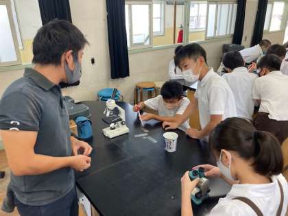 理科の学習で、学校の学習池の微生物を顕微鏡で観察しました。肉眼では見えない植物性プランクトンの姿も発見!小さなエビはとても大きく見えて驚いていました。このような小さな生物から食物連鎖が始まることを学びました。