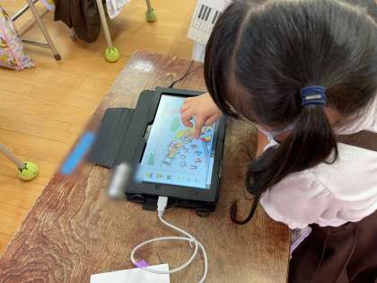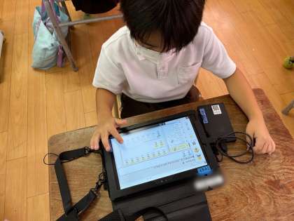 1年生でもタブレットを使用した学習を少しずつ進めています。毎朝スクールライフノートに1日の予定や自分の気持ちを入れたり、navimaを使ってドリル学習のやり方を学習したりしました。学習を進め、問題に正解するとコインがもらえるので、わくわくしながらドリルを進めています。