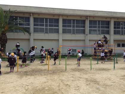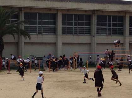 15分休みは子どもたちが運動場をいっぱいに使って、鬼ごっこやかけっこ、遊具遊びをしていました。元気いっぱいの子どもたちに負けじと教職員も鬼ごっこに参戦です!