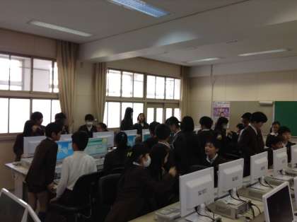 男女仲良く、誰が何を調べるかについて話し合い、パソコンに向かいました。