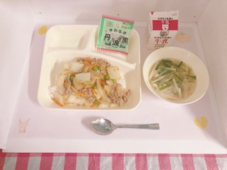 今日の給食には、たまねぎ、はくさい、にんじん、グリンピース、にんにく、しょうが、キャベツ、たけのこ、にらの9種類の野菜が使われていました。小学生のみなさんは1日に300gを目指して食べるようにしましょう!