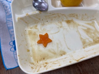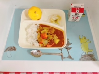 「ポークカレーライス〔米粉〕」は、小麦アレルギーのある児童も食べられるように米粉のカレールウの素を使用しています。豚肉を主材に、じゃがいも、たまねぎ、にんじん、青みにグリンピースを使用しています。今日のカレーには、ラッキーにんじんが入っていました☆