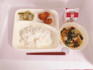 「すまし汁」は、鶏肉を主材に、キャベツ、たけのこ、にんじん、わかめを使用しています。