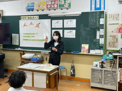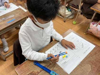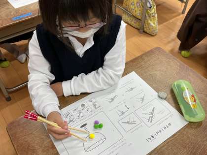 おはしを使って、フェルトボールを上手につかむことができました。玉入れのかごを見立てた絵に、フェルトボールを運びいれた瞬間に、両手をあげて「やったー!できたー!」と喜ぶ児童がいました。