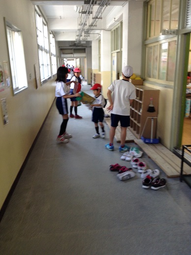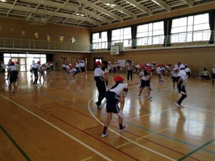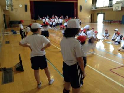6年生が1年生の体力テストのお手伝いに行きました。1年生にやさしく接してあげ、今日も頼もしい6年生!