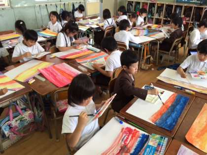 図工の授業では「僕の・私の夕焼け空」を作成しました。
