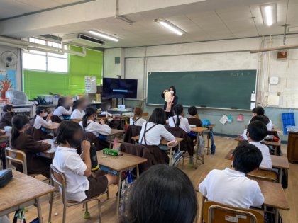 収穫の後に、栄養教諭の先生からお米になるまでの過程を教えていただきました。お米になって食べるまでには、たくさんの作業があることを知ることができました。