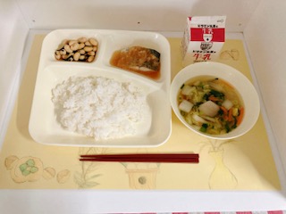 「さといものすまし汁」は、さといもとはくさい、たまねぎ、にんじん、青みに青ねぎを使用しています。