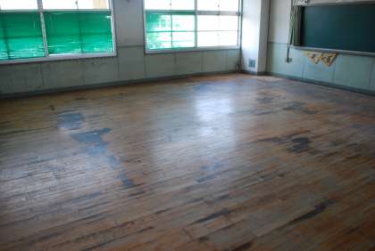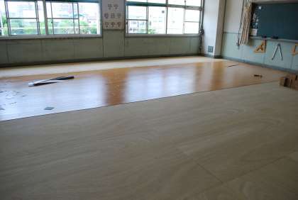 3年1組・2組の教室の床は、きしんだり、穴が開いていたり、汚れで黒くなっている箇所が多数ありました。2学期を気持ちよく迎えれるよう、夏休み終了間近の8月28日に今年は3年生の教室で張り替え工事が行われました。