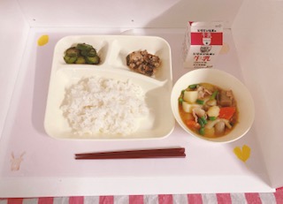 「豚肉とじゃがいもの煮もの」は、豚肉、じゃがいも、つなこんにゃく、たまねぎ、にんじん、青みにさんどまめを使用した煮ものです。