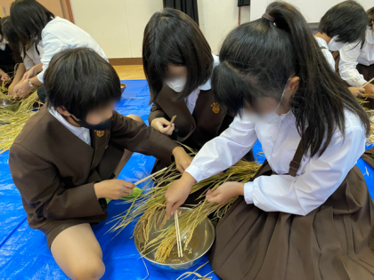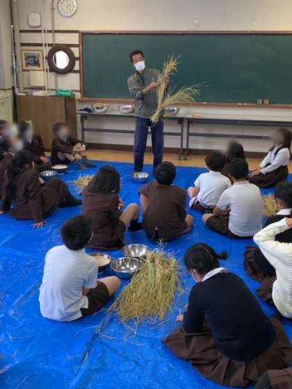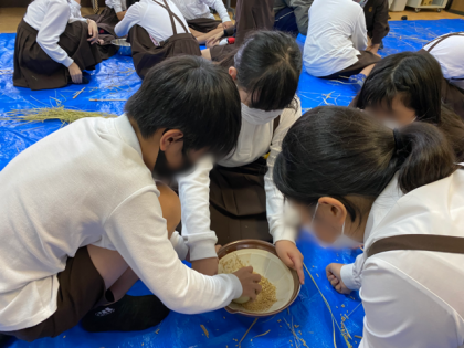 脱穀は手や割りばしでお米をはじいてボウルの中に集めました。もみすりはすり鉢に脱穀したものを入れて、ソフトボールを使ってこすりました。予想していた以上に力や時間がかかってみんなは驚いていました。