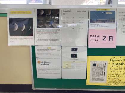 今週金曜日の夜に大阪や全国の地域で『部分月食』が観られます。『部分月食』が観測できる時間は、太陽が沈んで1時間ほどです。北恩加島小学校の講堂がある方角で観ることができます。月が最も欠ける『部分月食の最大時刻』は、午後6時2分となります。午後7時47分には大阪でも『部分月食』が終わりとなります。今回の部分月食は『部分』ですが、ほとんど月が地球の影に入るので、今回観測できるのは、皆既月食に近いものとなります。今週の金曜日の夜はいい天気になるといいですね。