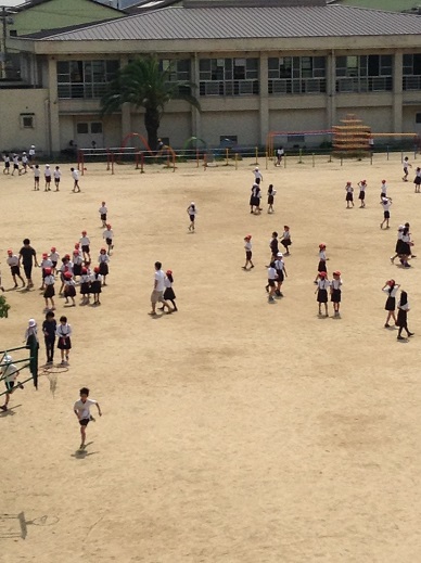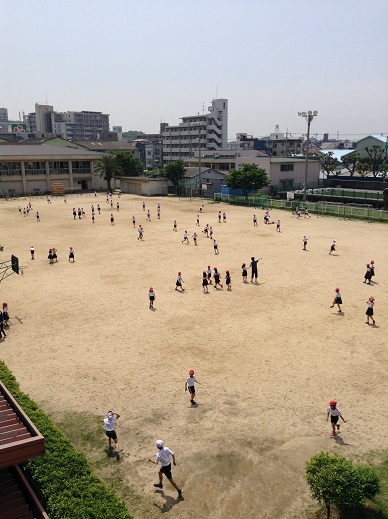 5月15日(金)今日は午前中からぐんぐん気温が上がりました。運動場は今日も元気にみんな遊んでいます。もちろん、熱中症にならないよう帽子をかぶっています。